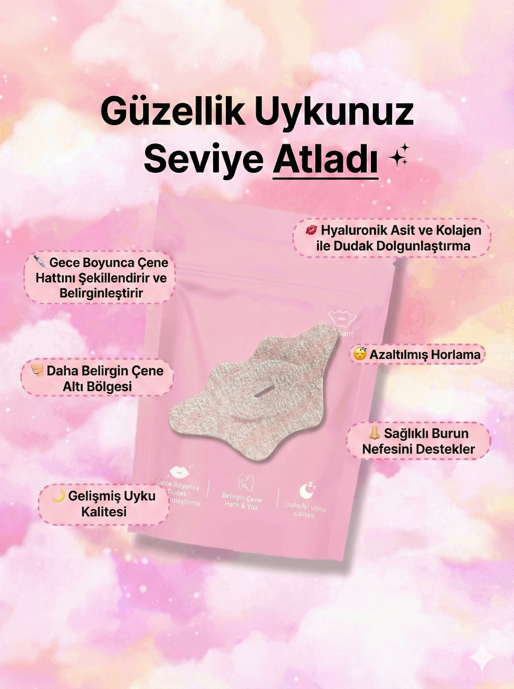 EKİM 2025SSelin Ö.Doğrulanmış KullanıcıYaklaşık 2 haftadır düzenli kullanıyorum. Jawline hattımda hafif bir belirginleşme hissediyorum ama asıl olayı cildimin nemli kalması. Sabah kupkuru bir ciltle uyanmıyorum artık.Yüz Şekillendirici & Horlama Önleyici Uyku Ağız Bandı